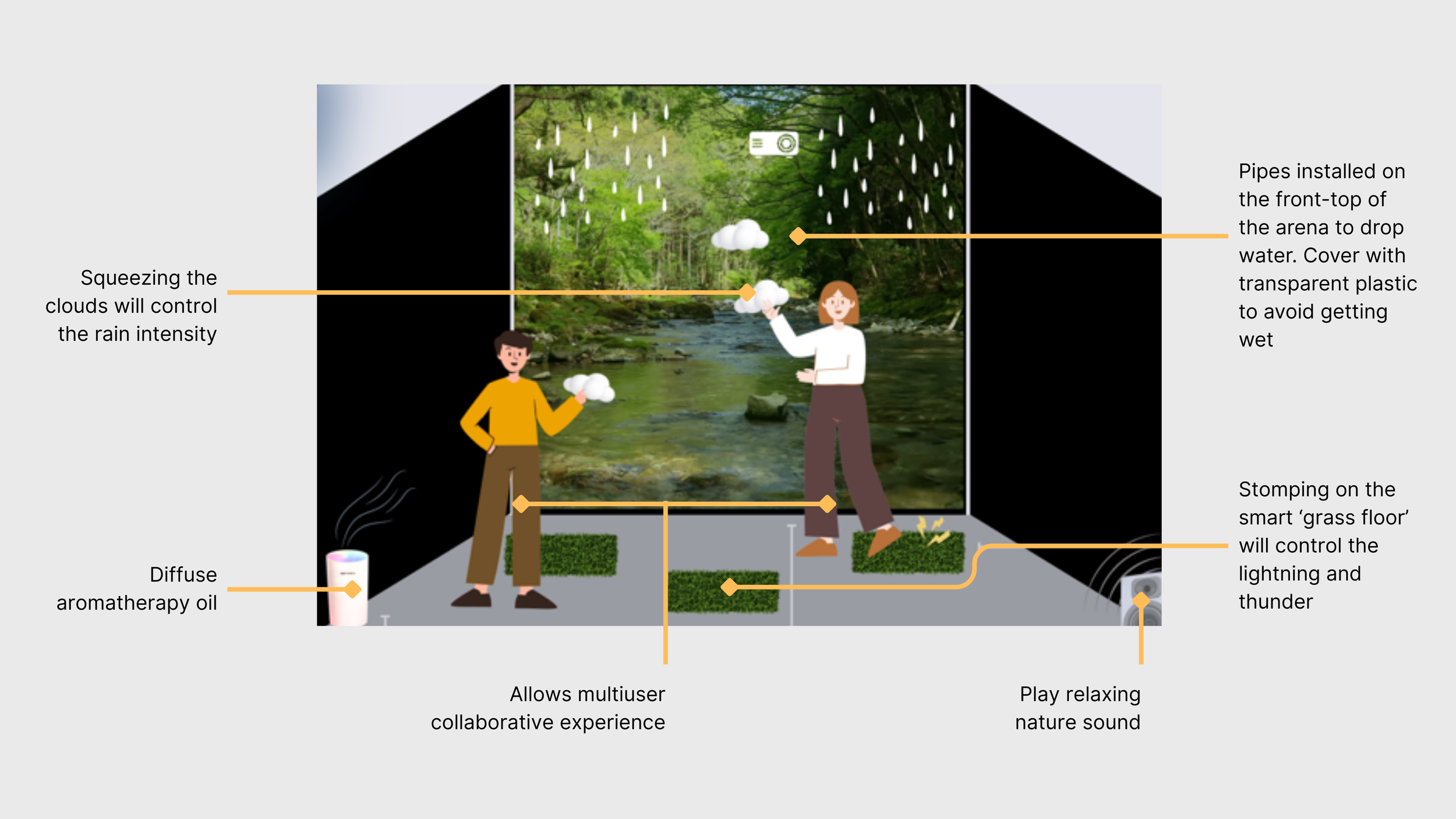 A playful, immersive room simulates a rainy natural environment, engaging touch, sight, hearing, and scent, where users interact to reduce stress
